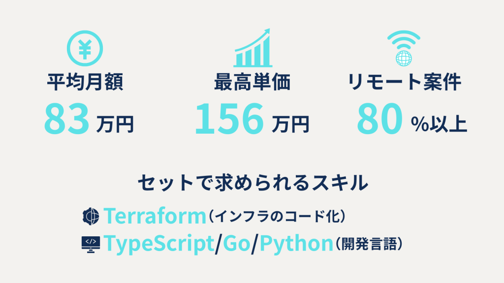 - 傾向: スキル次第で月額100万円を超える案件も珍しくありません。特に「インフラ設計 × コード管理(IaC)」ができるエンジニアには、100万円〜150万円レンジの提示が多くなっています。